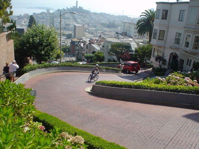 We spend three nights in San Francisco, and hit all the tourist spots – Cisco tower, a concrete money trap at the western end of the city overlooking the bay, and Golden gate and Bay bridges; Lombard St – the curviest in the world, which I cycle down twice, the uphill to get there restructuring my thighs and neck into aching highly stressed cords ready to snap.