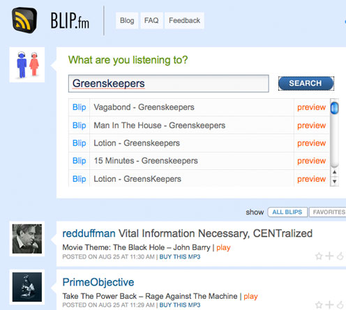 New music sharing service Blip.fm bills itself as Twitter for music. Really it’s not. Like twitter it allows brief posts to be quickly shared between friends. Unlike twitter the service doesn’t provide for posting (or receiving posts) via SMS. That’s sort of immaterial, because what Blip does do is freaking awesome. Once you’ve created an account on the service, you carry out a search for the artist or song of your choice (so far almost everything I’ve looked for has been found – and you can upload your own music if a track’s missing), hit ‘blip’, add a brief text message and click ‘ok’. Instantly, not only are you listening to the song you’ve chosen, but you’re also acting as a time shifted DJ for anyone who adds you as a friend. Sure the service will likely face the chop, from a terrified, backward and thankfully dying music industry – like the much loved muxtape, but right now it acts as the slickest, fastest and most fun way ever to be an online DJ. Most of the time you don’t have to upload anything – you can play music for your friends anywhere in the world with a wee search, a little comment and a click.